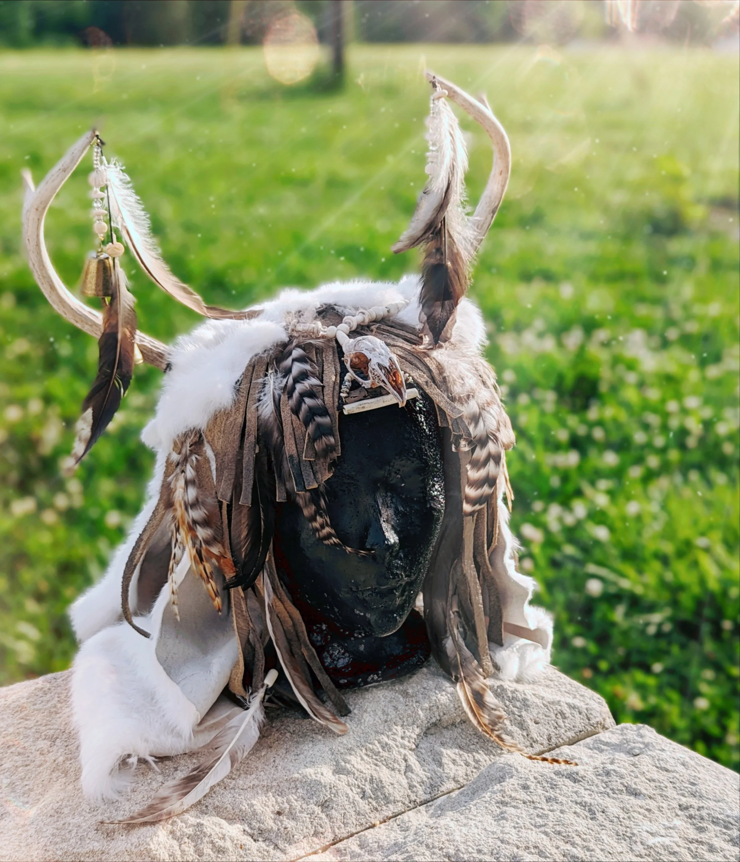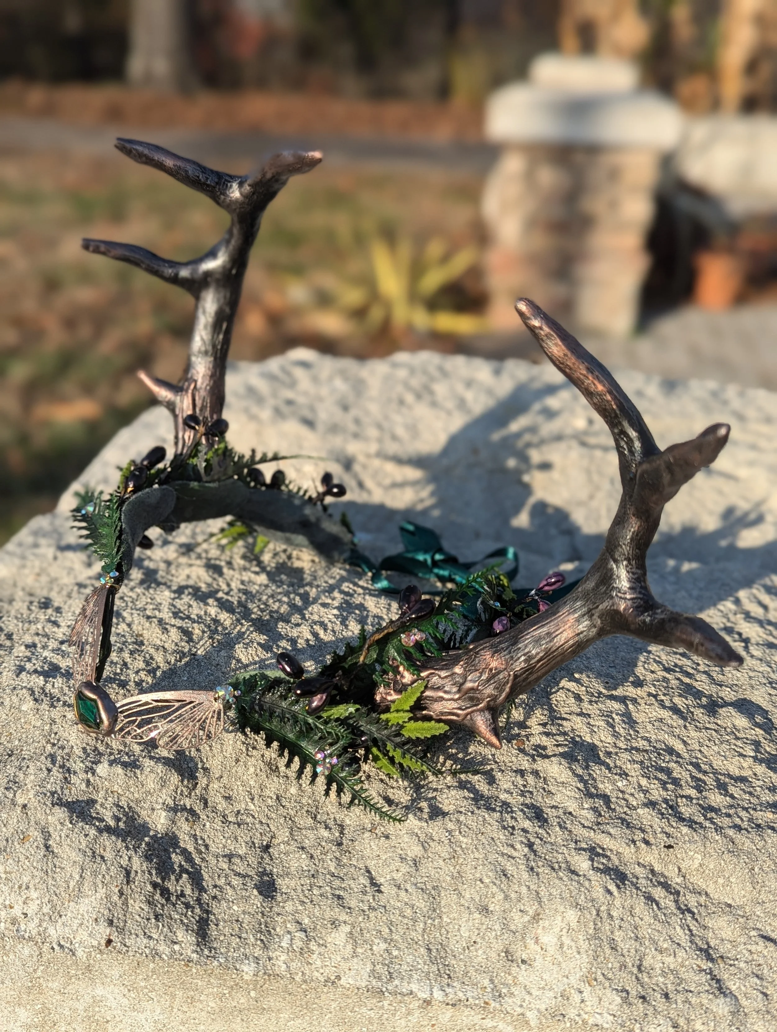 I love the limitless options of crown making. Everything from the simple tiara to the elaborate antler crowns, both Fae and Shamanic types, bring joy and challenge in their creation. Every flower cluster is attached using jump rings meticulously hand crimped and adorned with hand placed glass rhinestones and gems. Real or handcrafted antlers and horns are carefully placed for optimal balance and weight. Shamanic crowns are then decked with fur, bone and feather elemants which I marry with semi precious gem beads such as moonstone or labradorite. Fae type crowns also gain the bead elements, though paired with rhinestones, chain, metal and fur for luxury fit for the royalty of Portal Room Studios.
